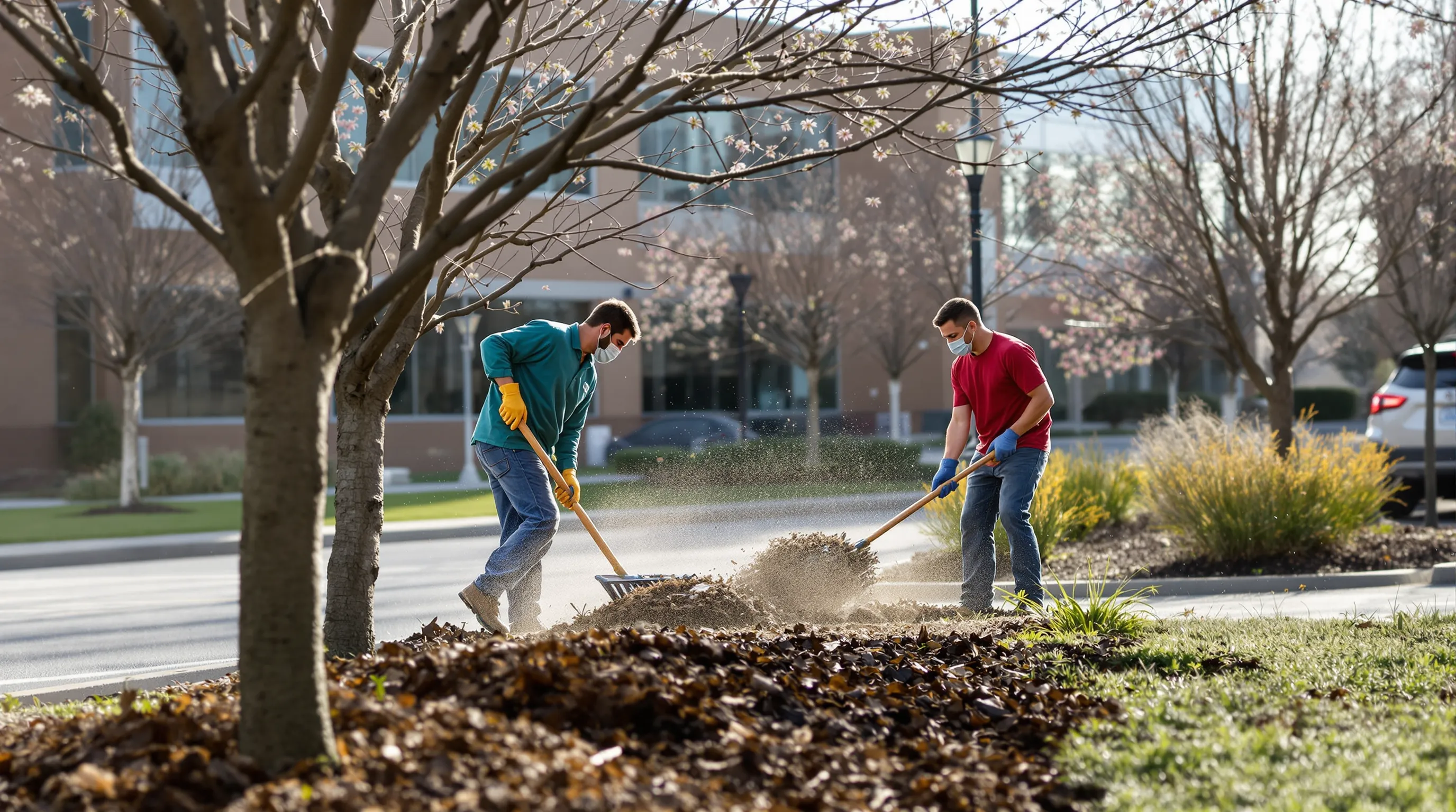 Post-winter cleanup including debris, salt residue, dead material, and bed preparation.